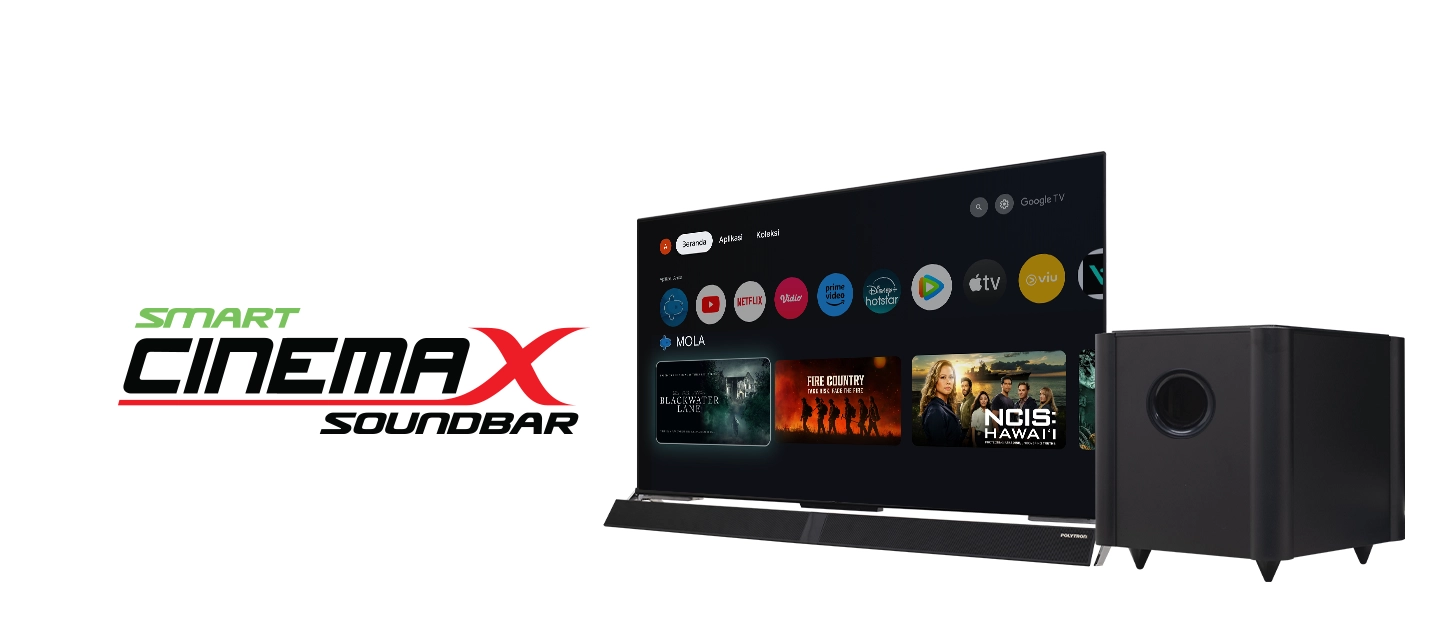 Salah satu keunggulan utama POLYTRON PLD 32RG9059 dibanding TV lain di kelasnya adalah sistem audionya. Polytron menyematkan teknologi Cinemax Soundbar yang terintegrasi langsung di bagian bawah panel layar.